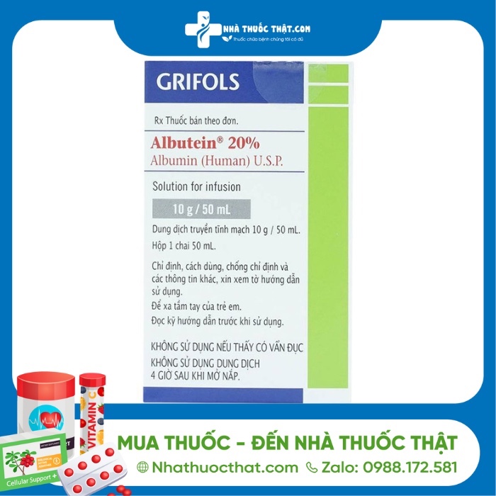 Albutein 25% là sản phẩm của công ty Grifols Biologicals Inc, có thành phần chính là albumin (Người). Thuốc được chỉ định trong các trường hợp sau: Ðiều trị sốc giảm thể tích; là thuốc phụ trợ trong thẩm tách máu cho bệnh nhân chịu sự thẩm tách dài ngày hoặc cho những bệnh nhân quá tải dịch và không thể dung nạp lượng lớn dung dịch muối trong điều trị sốt hoặc hạ huyết áp; trong các phẫu thuật nối tắt tuần hoàn tim phổi, tim phổi; tuy nhiên chế độ điều trị tối ưu bằng dịch truyền chưa được xác lập.