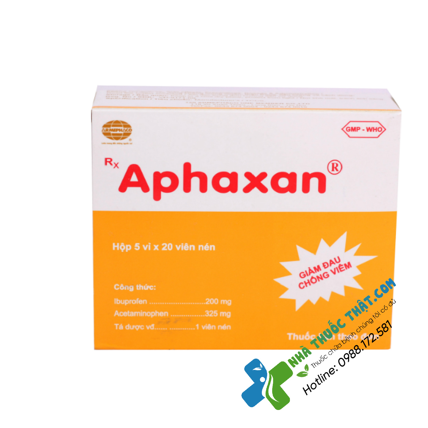 Aphaxan là sản phẩm của công ty cổ phần armephaco, thành phần chính gồm ibuprofen và acetaminophen là thuốc giảm đau, kháng viêm.Aphaxan được bào chế dưới dạng viên nén, quy cách đóng gói bao gồm hộp 5 vỉ x 20 viên nén… Dưới đây là thông tin về sản phẩm