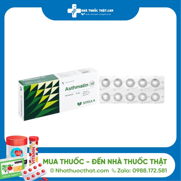 Asthmatin 10 của Công ty TNHH LD STELLAPHARM – Chi nhánh 1, thành phần chính montelukast. Thuốc được dùng để điều trị và phòng ngừa lâu dài bệnh hen suyễn ở người lớn và trẻ em từ 12 tháng tuổi trở lên; giảm triệu chứng viêm mũi dị ứng (viêm mũi dị ứng theo mùa ở người lớn và trẻ em từ 2 tuổi trở lên và viêm mũi dị ứng quanh năm ở người lớn và trẻ em từ 6 tháng tuổi trở lên).
