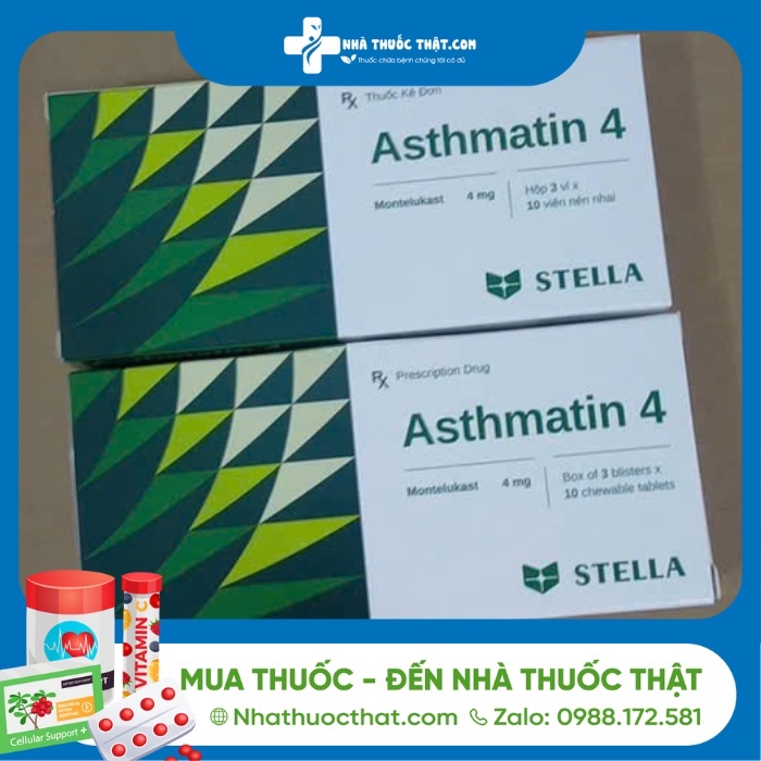 Asthmatin 4 của Công ty TNHH LD STELLAPHARM – Chi nhánh 1, thành phần chính montelukast. Thuốc được dùng để điều trị và phòng ngừa lâu dài bệnh hen suyễn ở người lớn và trẻ em từ 12 tháng tuổi trở lên; giảm triệu chứng viêm mũi dị ứng (viêm mũi dị ứng theo mùa ở người lớn và trẻ em từ 2 tuổi trở lên và viêm mũi dị ứng quanh năm ở người lớn và trẻ em từ 6 tháng tuổi trở lên).