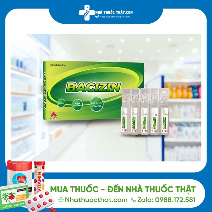 Bacizin là sản phẩm bổ sung lợi khuẩn, chất xơ và kẽm giúp cải thiện hệ vi sinh đường ruột, giúp ăn ngon, tăng sức đề kháng, giúp giảm triệu chứng đau bụng, tiêu chảy do rối loạn tiêu hóa, mất cân bằng hệ vi sinh đường ruột. Đồng thời, hỗ trợ phòng ngừa viêm nhiễm đường hô hấp trên, thanh lọc, đào thải các gốc tự do, loại bỏ độc tố ra khỏi cơ thể. Dành cho người bị tiêu chảy, rối loạn tiêu hóa và trẻ biếng ăn, kém hấp thu chất dinh dưỡng. Sản phẩm được sản xuất tại công ty Cổ phần Dược phẩm CPC1 Hà Nội.