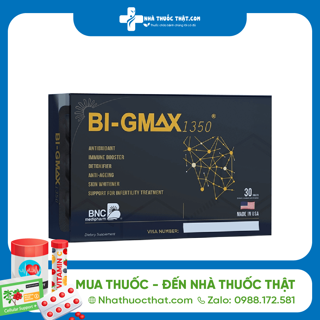 Bi-Gmax 1350 là sản phẩm với công dụng chính hỗ trợ giúp chống oxy hóa, hỗ trợ hạn chế quá trình lão hóa của cơ thể, hỗ trợ tăng cường sức khỏe… Dưới đây là thông tin về sản phẩm