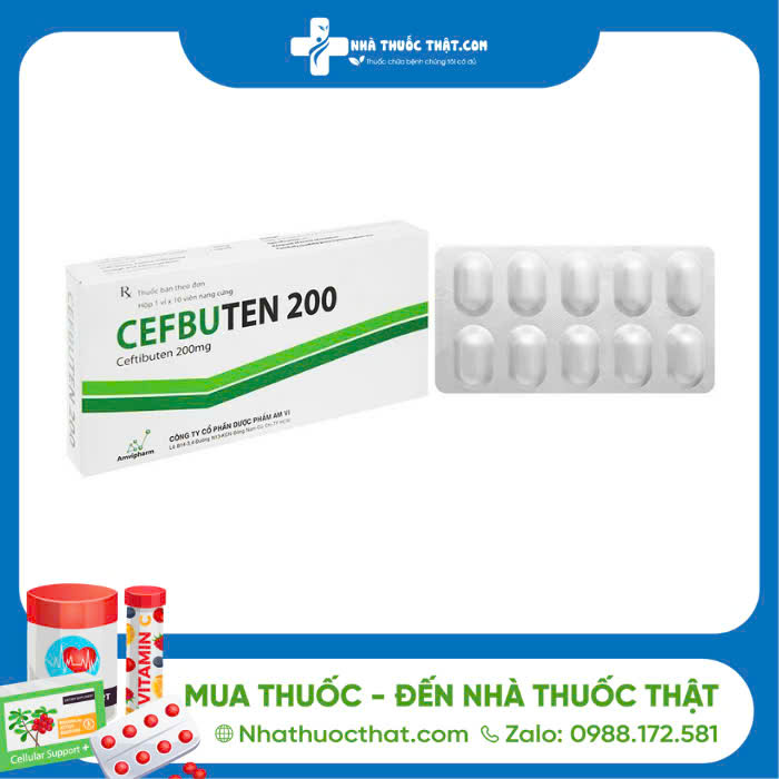 Cefbuten 200 của Công ty cổ phần Dược phẩm Am Vi, thành phần chính là ceftibuten dihydrat. Thuốc dùng trong điều trị các trường hợp nhiễm khuẩn vừa và nhẹ; viêm tai giữa cấp; viêm họng, viêm amidan; nhiễm khuẩn đường tiết niệu.