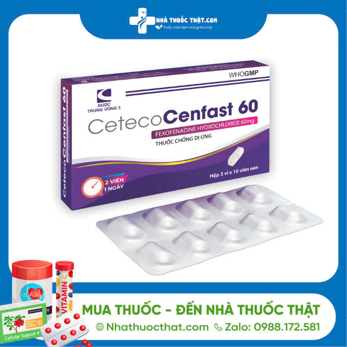 Ceteco Cenfast 60 là loại thuốc thuộc nhóm thuốc chống dị ứng và dùng trong các trường hợp quá mẫn. Thuốc có thành phần chính là Fexofenadin hydrochlorid 60 mg