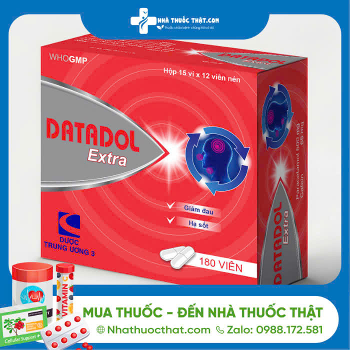 Datadol Extra (Hộp 15 vỉ x 12 viên), được sản xuất bởi Công Ty Cổ Phần Dược Trung Ương 3, có chứa thành phần chính là Paracetamol 500mg, caffeine 65mg, được sử dụng để điều trị đau và sốt như: đau đầu, đau nửa đầu, đau lưng, đau răng và đau bụng kinh, giảm các cơn đau do viêm xoang và giảm nhẹ các triệu chứng do cảm lạnh, cúm, đau họng, kèm theo mệt mỏi và buồn ngủ.