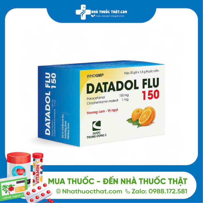 Datadol Flu với thành phần là paracetamol 150mg điều trị cảm sốt, đau đầu, nghẹt mũi ở trẻ em từ 1-4 tuổi
