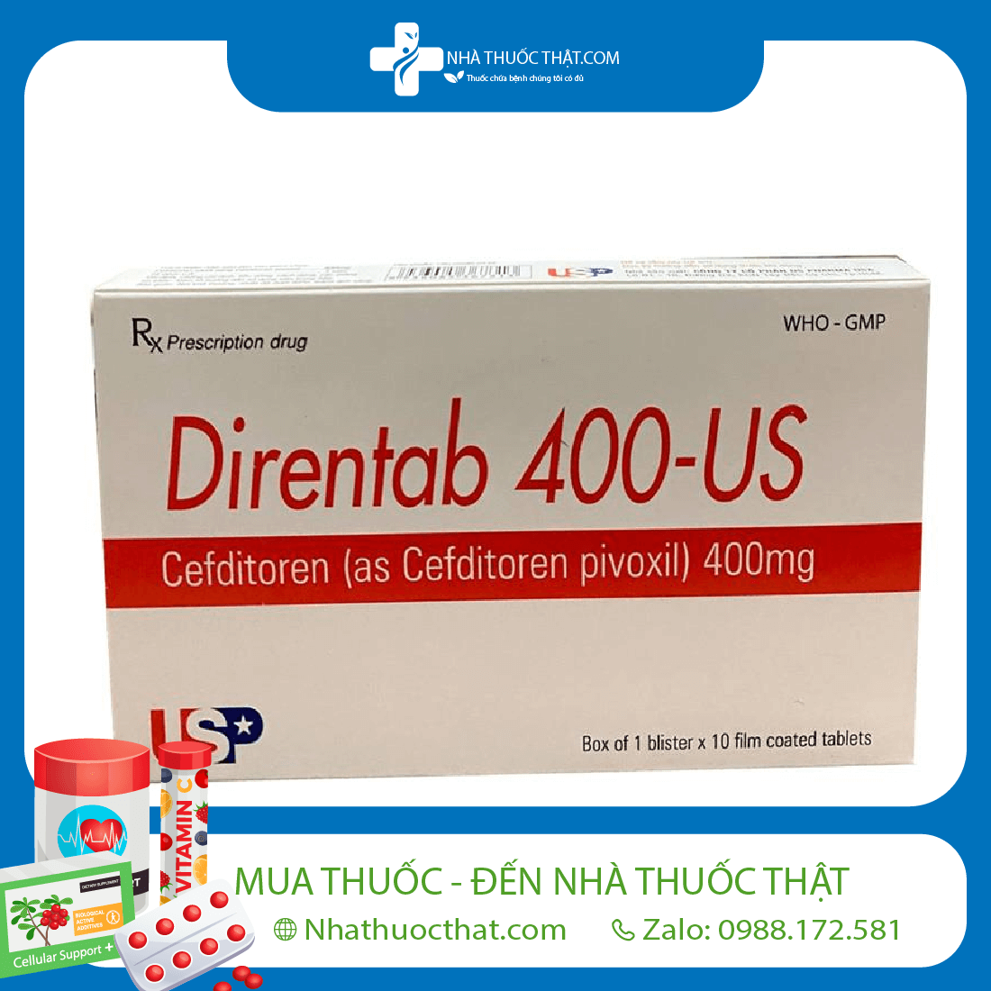 - Nhờ các đặc tính này, Direntab 400-US được dùng để điều trị các nhiễm khuẩn hô hấp, tiết niệu, da và mô mềm do vi khuẩn nhạy cảm gây ra, đồng thời mang lại hiệu quả nhanh và an toàn khi sử dụng đúng chỉ định.