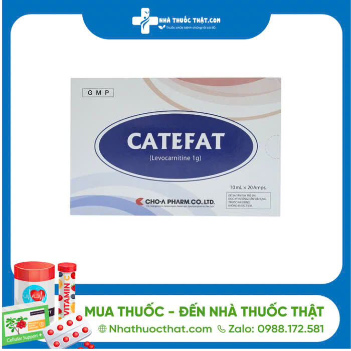 Thuốc Catefat do Công ty Choa Pharm. CO., LTD. Hàn Quốc sản xuất. Có chứa Levocarnitin 10 mg được chỉ định điều trị thiếu carnitin nguyên phát và thứ phát, rối loạn chuyển hoá cơ tim do bệnh tim thiếu máu cục bộ: Đau thắt ngực và nhồi máu cơ tim, giảm mệt mỏi tinh thần và thể lực ở người già, người bị hội chứng mệt mỏi mạn tính hoặc mệt mỏi do các thuốc hóa trị kháng ung thư, interferon.