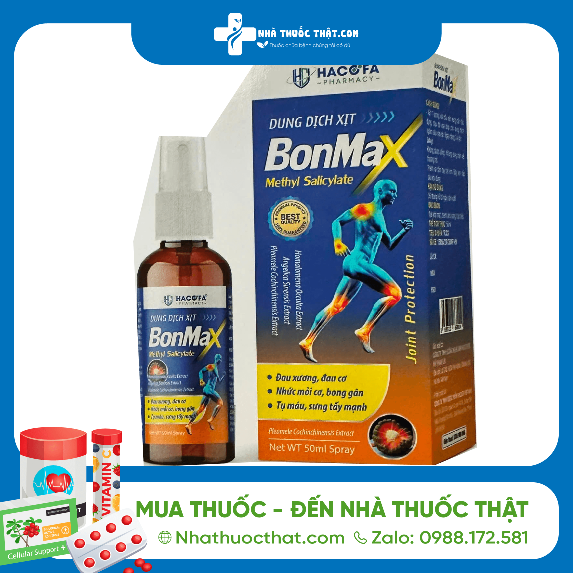 Dung dịch xịt BonMax với công dụng dùng để xoa hoặc massage ngoài da, có tác dụng, Giúp làm ấm và nóng da nhanh chóng… Dưới đây là thông tin về sản phẩm