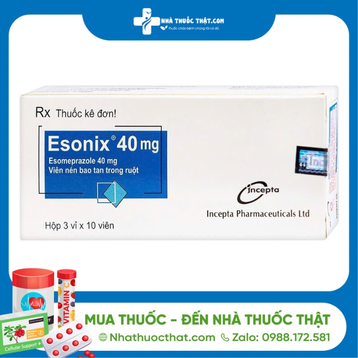 Esonix 40 là sản phẩm của Incepta Pharmaceuticals Limited, thành phần chính esomeprazole, thuốc dùng để điều trị bệnh trào ngược thực quản (GERD), làm giảm nguy cơ loét dạ dày liên quan đến thuốc chống viêm NSAID và diệt trừ H. pylori để làm giảm nguy cơ tái phát loét tá tràng.