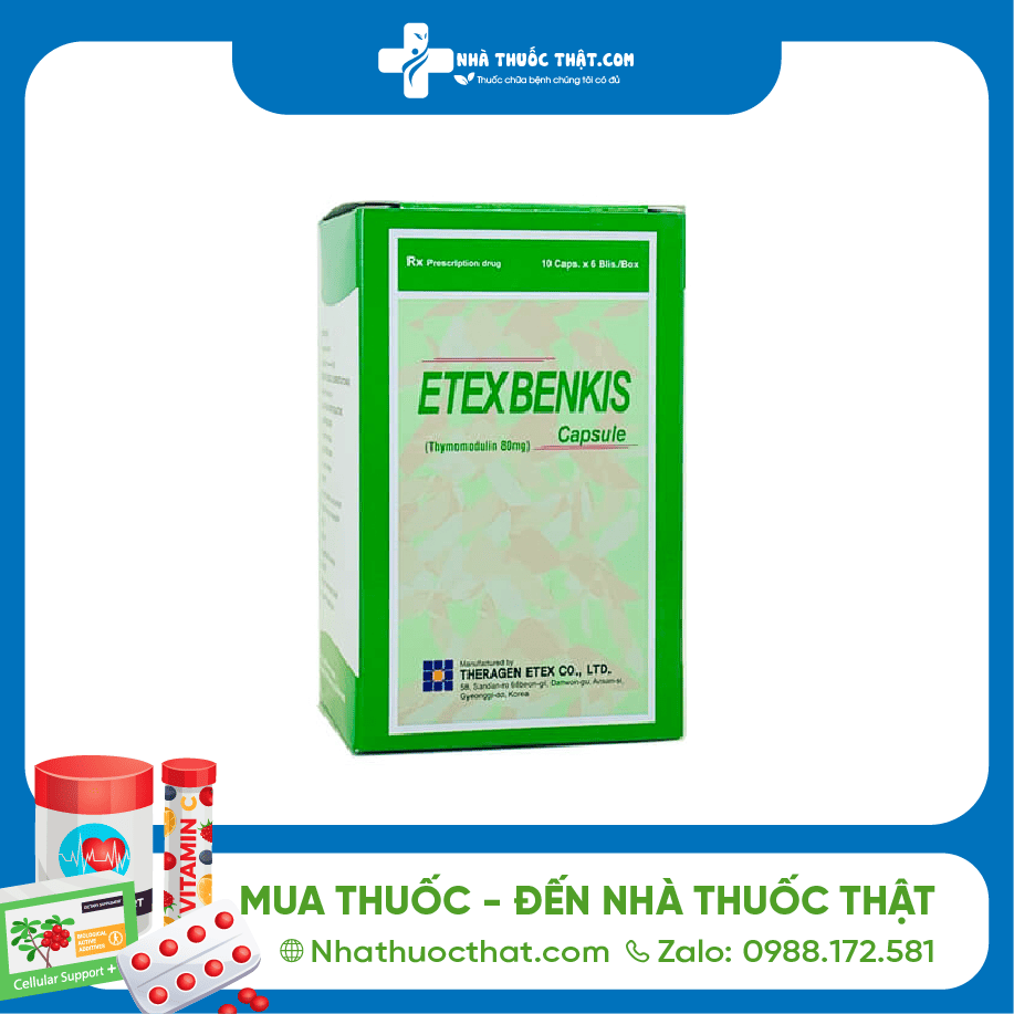 - Kết luận: Etexbenkis Capsule là một sản phẩm hỗ trợ miễn dịch đơn giản và hiệu quả với thành phần chính Thymomodulin 80mg. Nó phù hợp cho những người cần tăng cường sức đề kháng, phục hồi miễn dịch sau điều trị (hóa trị, xạ trị), hoặc hỗ trợ trong các bệnh lý như HIV, dị ứng. Tuy nhiên, đây không phải là thuốc đặc trị, và hiệu quả thực tế cần được đánh giá thêm dựa trên nguồn gốc sản phẩm và phản hồi từ người dùng. Nếu bạn có ý định sử dụng, nên tham khảo ý kiến bác sĩ và kiểm tra thông tin tá dược từ nhà sản xuất để đảm bảo an toàn.