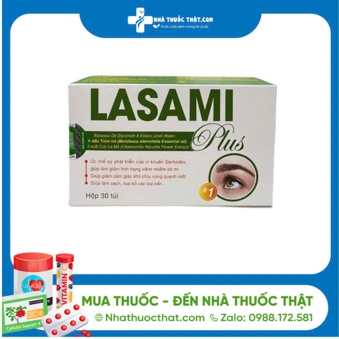 - Lasami Plus là sản phẩm chuyên dụng được tẩm sẵn các thành phần như Babassu Oil Glycereth-8 Esters, tinh dầu Tràm Trà, chiết xuất Cúc La Mã, giúp loại bỏ bụi bẩn, vi khuẩn, dưỡng ẩm vùng da quanh mắt, dùng cho người khô mắt, viêm bờ mi.