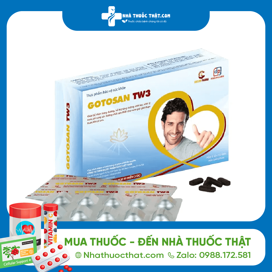Gotosan TW3 là sản phẩm hỗ trợ sinh lý nam, chứa các thành phần thảo dược tự nhiên giúp bổ thận, tráng dương, tăng cường sinh lực và cải thiện sức khỏe sinh sản nam giới, đặc biệt hữu ích cho giai đoạn chuẩn bị sinh con.