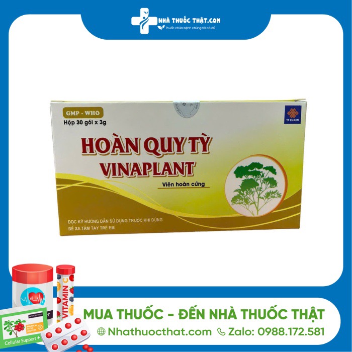 Hoàn quy tỳ Vinaplant là sản phẩm của Công ty cổ phần dược phẩm Thành Phát, có tác dụng ích khí, bổ huyết, kiện tỳ dưỡng tâm. Ngoài ra Hoàn quy tỳ Vinaplant còn giúp giảm các triệu chứng chủ trị tâm tỳ hư, khí huyết hư như: lo sợ, hay quên, đánh trống ngực, hồi hộp, mất ngủ, ngủ mê, hơi thở ngắn, mệt mỏi, kém ăn, suy nhược thần kinh, suy nhược cơ thể. Đọc kỹ hướng dẫn sử dụng trước khi dùng. Để xa tầm tay trẻ em.
