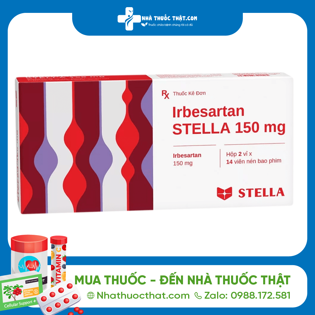 Irbesartan 150 là thuốc thuộc nhóm đối kháng thụ thể angiotensin II (ARB), có tác dụng giãn mạch, hạ huyết áp và bảo vệ chức năng thận. Thuốc được sử dụng trong điều trị các bệnh lý tim mạch và thận mạn tính liên quan đến tăng huyết áp, đái tháo đường.