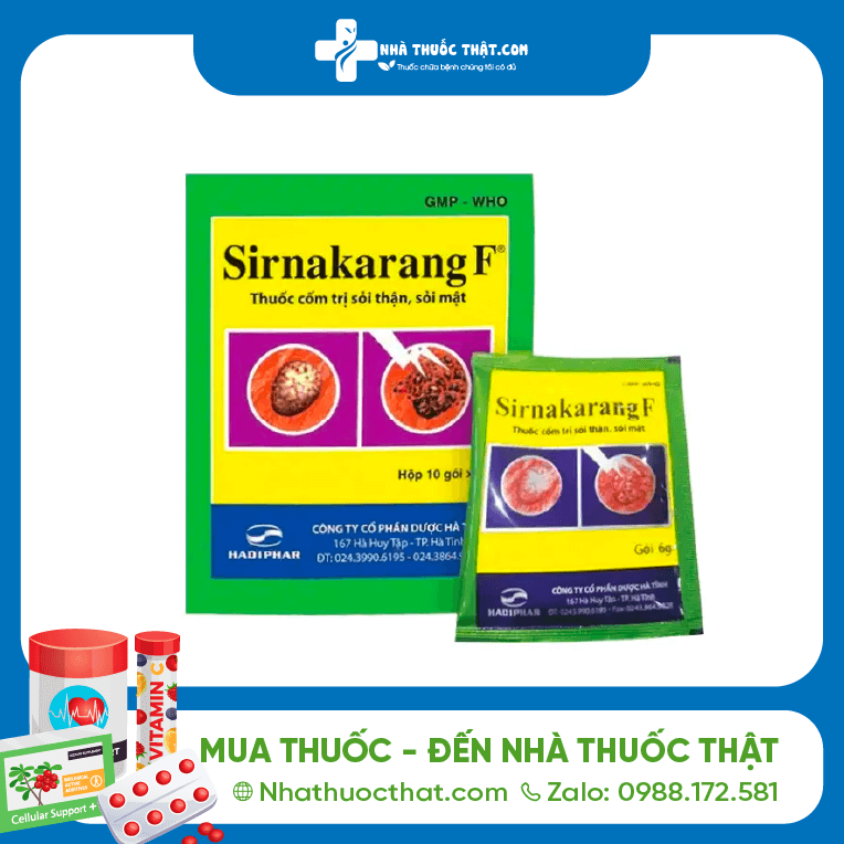 Sirnakarang F là sản phẩm với công dụng chính giúp phòng và điều trị sỏi thận. sỏi tiết niệu, bàng quang… Phòng và điều trị viêm túi mật, viêm đường tiết niệu, viêm thận… Dưới đây là thông tin về sản phẩm