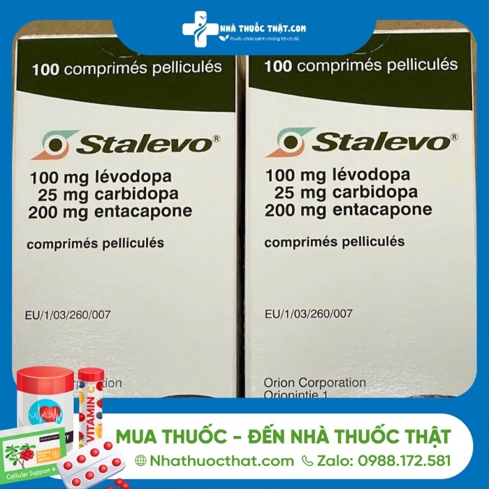 Stalevo của Công ty Orion Corporation, thành phần chính là levodopa 100mg, carbidopa 25mg, entacapone 200mg. Thuốc dùng để điều trị bệnh nhân bị bệnh Parkinson và có những biến động về vận động vào cuối liều dùng mà không ổn định được khi điều trị bằng levodopa/chất ức chế dopa decarboxylase (DDC).