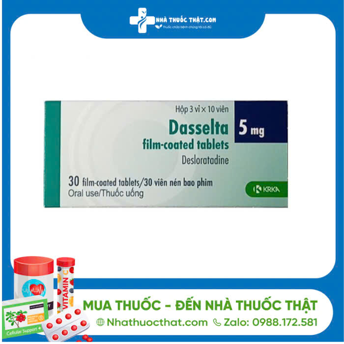 Dasselta 5mg là sản phẩm của Công ty Krka, thành phần chính là desloratadine. Thuốc được chỉ định điều trị viêm mũi dị ứng, giúp làm giảm nhanh các triệu chứng như hắt hơi, chảy mũi, ngứa mũi, nghẹt mũi/khó thở, kèm kích ứng mắt như ngứa mắt, chảy nước mắt và đỏ mắt, ngoài ra thuốc còn dùng điều trị làm giảm các triệu chứng liên quan đến mày đay mạn tính.