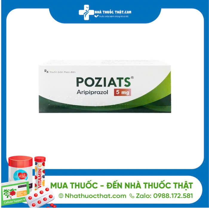 Poziats 5 mg được sản xuất bởi Công ty Cổ phần Dược phẩm Me Di Sun, thành phần chính là Aripiprazol, được dùng để điều trị tâm thần phân liệt; điều trị rối loạn lưỡng cực cấp tính; hỗ trợ điều trị rối loạn trầm cảm; điều trị triệu chứng dễ kích động, thay đổi tâm trạng do rối loạn tự kỷ; điều trị hội chứng Tourette (không kiểm soát ngôn ngữ).