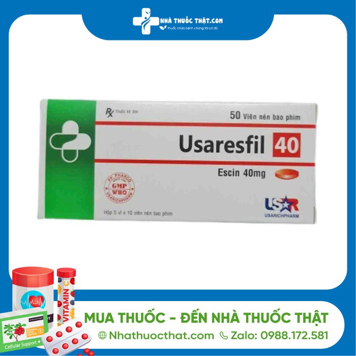 Usaresfil 40 là thuốc kê đơn, thường được sử dụng trong điều trị bệnh trĩ nội, giãn tĩnh mạch, viêm tĩnh mạch chân… nó còn làm giảm tình trạng sưng, bầm tím. Đây là một sản phẩm của Công ty Cổ phần Dược phẩm Phong Phú, được sản xuất tại Chi nhánh nhà máy Usarichpharm.