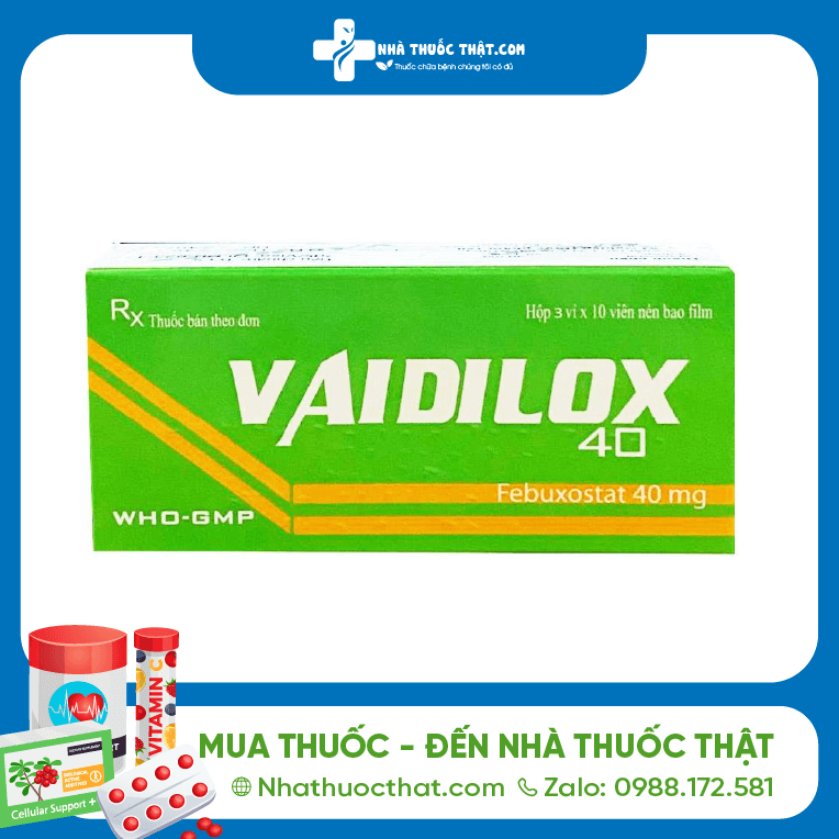 Vaidilox 40 là sản phẩm được chỉ định để điều trị cho bệnh nhân bị Gout, người tăng aicd Uric máu do suy giảm chức năng thận, hóa xạ trị, dự phòng cơn Gout cấp tính,… Dưới đây là thông tin về sản phẩm