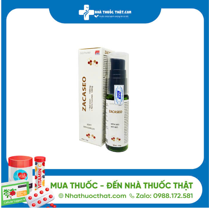 Zacaseo gel do Công ty CP TM Quốc tế Dược Pháp Mỹ sản xuất, có tác dụng trị sẹo lồi, sẹo lõm, sẹo do mụn, bỏng, phẫu thuật, vết côn trùng cắn, vết cắt.
